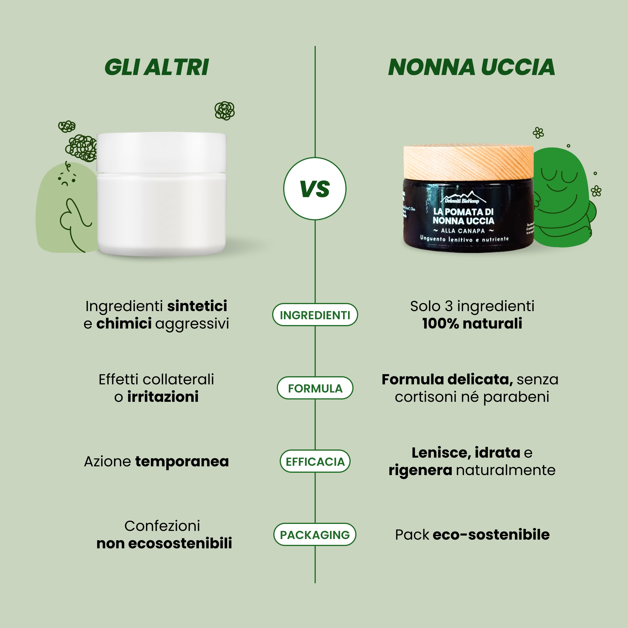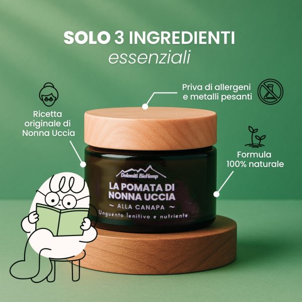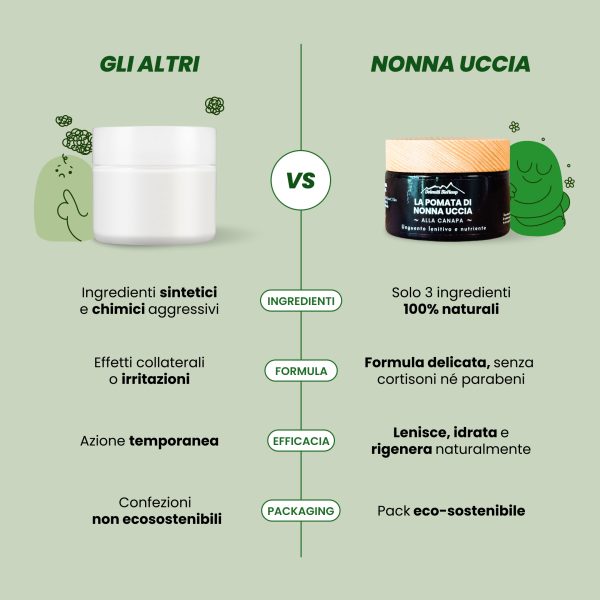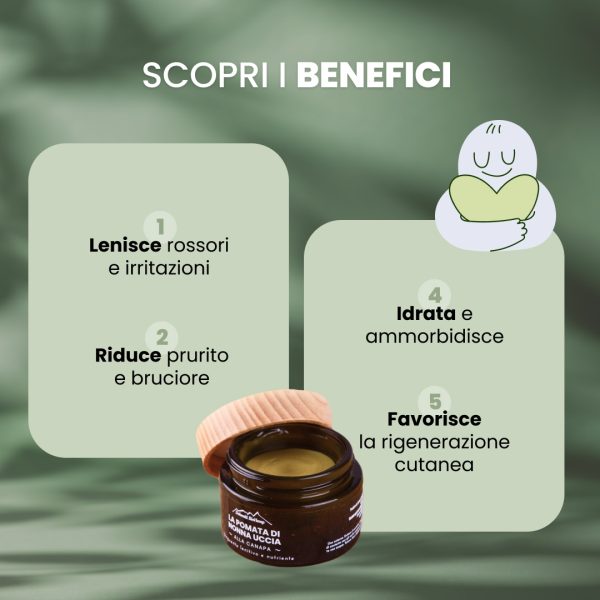 A healing ointment based on the traditional recipe of Grandma Uccia, who selected each ingredient for its soothing and anti-inflammatory properties, achieving a gentle yet effective formula to support skin wellness.